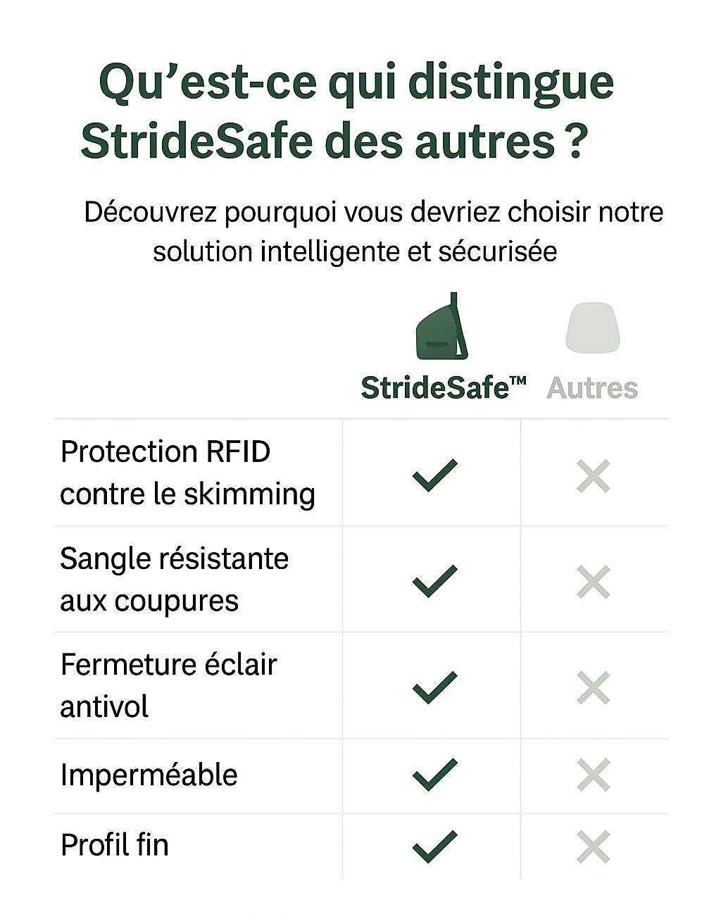 StrideSafe – sécurité garantie grâce à un matériau anti-coupure. Ce sac est fabriqué en tissu anti-coupure et ses sangles renforcées sont également anti-coupure. Des fermetures éclair dissimulées et un design discret protègent vos objets de valeur lors de vos déplacements.